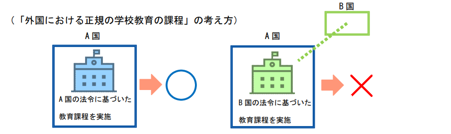 なお、「外国において学校教育における 12 年の課程を修了」とは、「外国における正規の学校教育における 12 年目の課程を修了」という意味になりますが、これに該当するためには、当該学校等の教育課程が、当該学校等が所在する国の法令に基づいている必要がありますので、A 国に所在する IS が B 国の学校に準拠し、B 国において正規のものと認められる教育課程を実施していたとしても、A 国の法令上正規の学校教育と認められないのであれば、「外国において学校教育における12 年の課程を修了」には該当しません。