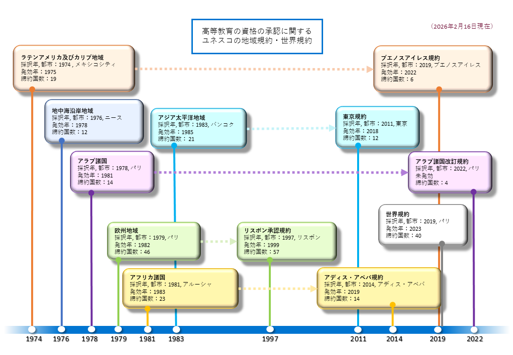 ユネスコは、1970年代以降の高等教育における国際的な移動の高まりにより、学修経験の承認を他の国においても衡平・公正に取り扱うことの重要性を認識し、高等教育の資格(入学資格、単位、学位を含む。)の承認等を促進させ、高等教育の地域性等に配慮した6つの「地域規約」が採択及び発効しており、1990年代後半からはこれらの地域規約の改訂が始まっています。各地域規約および改訂規約を含めて、2026年2月16日までに129か国がこれらの規約を締結しています(うち半数以上が複数の規約を締結)。